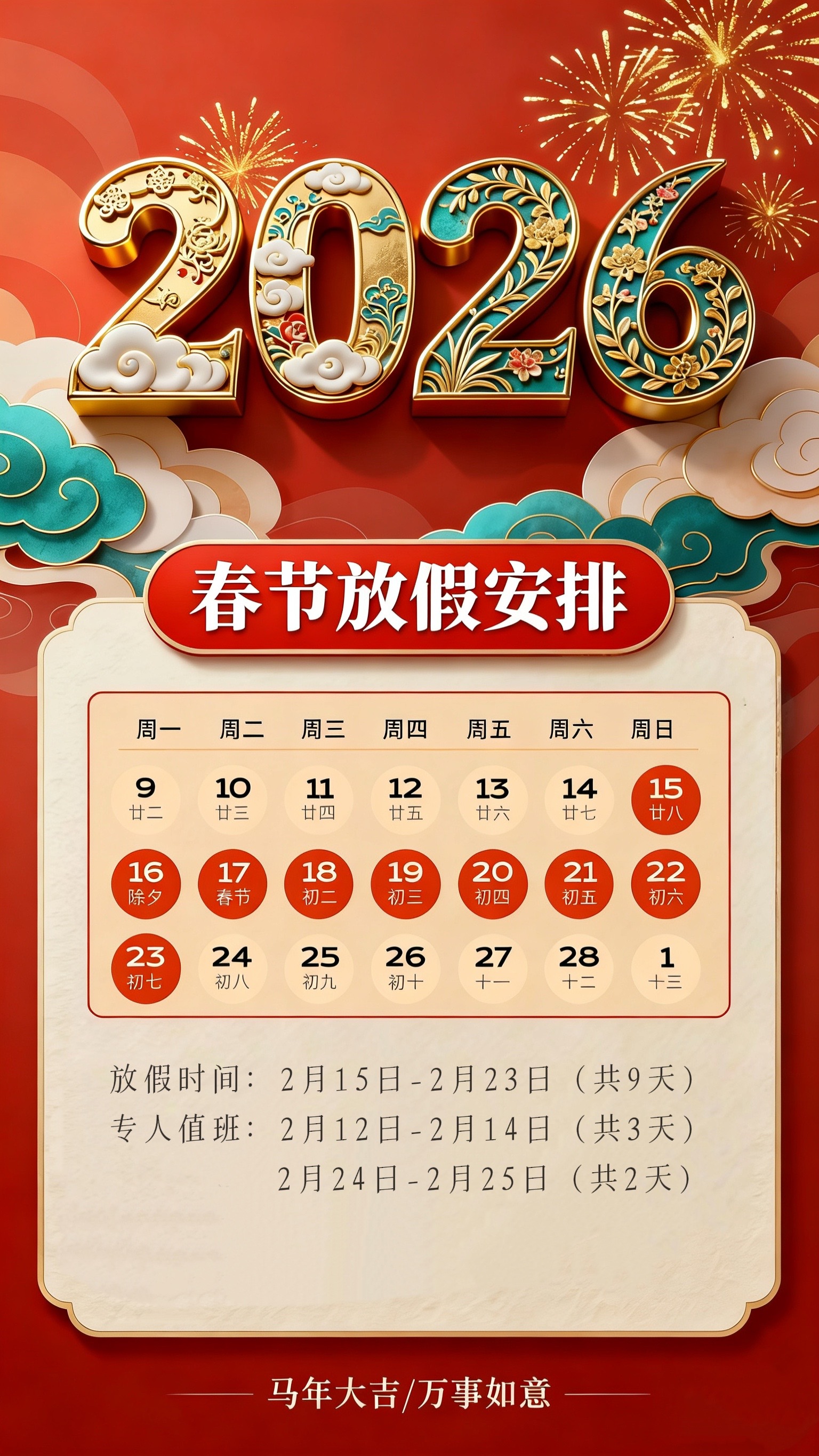 放假时间:2月15日—2月23日(共9天)